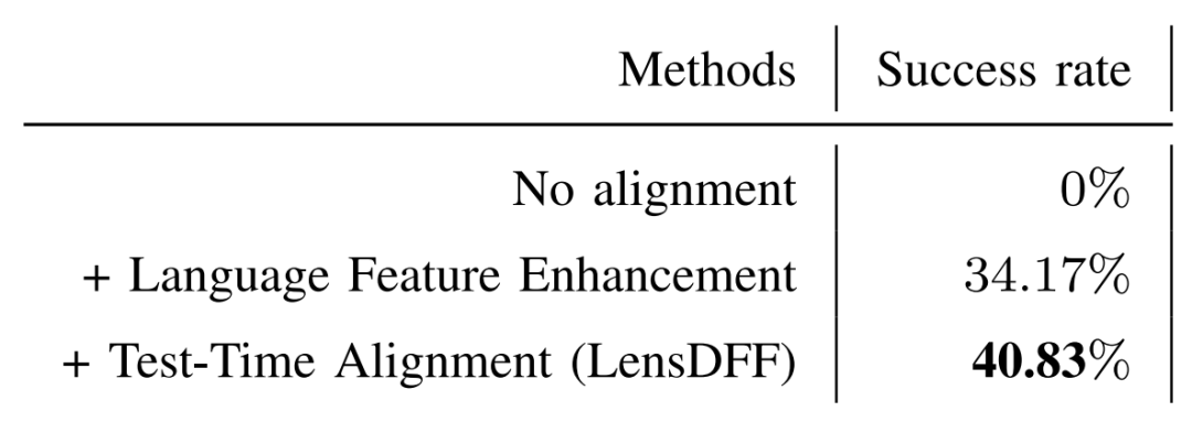 基于这个发现,LensDFF 想出了不用额外训练的语言增强特征对齐办法:先从 CLIP 这类视觉语言模型里提取物体的语言特征,把它当成语义上的 “参照物”;再把不同视角下的 2D 视觉特征投射到语言特征的空间里,用 sigmoid 激活函数做归一化处理。这样既能留住视觉特征本身的幅度信息,又能保证不同视角下的语义是统一的;到了测试的时候,还会用自适应的语言对齐方式,通过算演示时的语言特征和测试时的语言特征之间的余弦相似度,灵活决定是直接用演示的特征,还是把两种特征融合起来,让机器人能顺利应对没见过的物体。