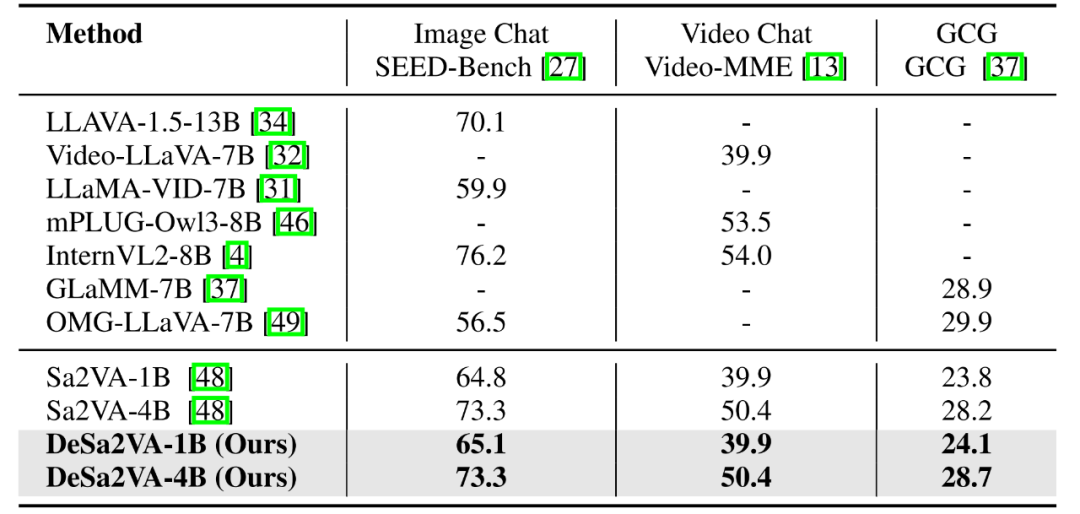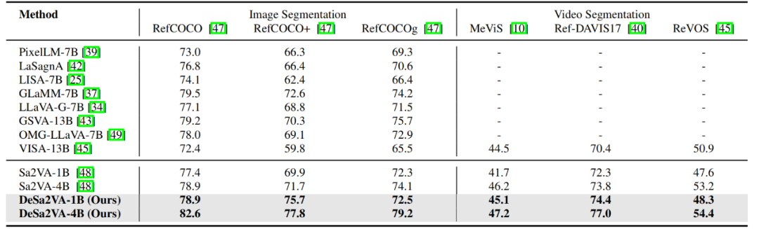 表 1: 图像/视频分割任务性能对比结果。无论采用 1B 还是 4B 模型规模,研究团队的 DeSa2VA 均在图像与视频分割任务上全面超越基线模型。