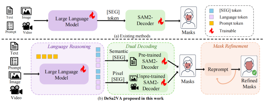 图 1:本文提出的 DeSa2VA 的创新点。(a) 基线模型。(b) 研究团队的模型引入了解耦增强提示模块(decoupling-enhanced prompt module),将信息解耦为文本和视觉线索,以增强分割模型的提示能力。同时,研究团队引入了文本理解预训练,使 SAM-2 能够处理解耦后的文本信息。