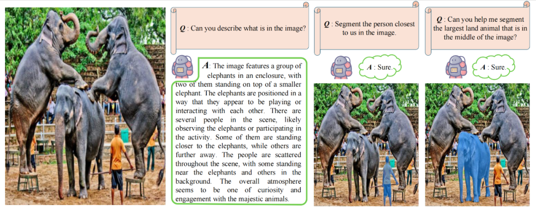 图 3:问答与分割结果展示。左侧为输入图像及模型生成的准确文本描述,右侧为对应的分割结果,展示了模型在满足语义问答的同时,具备精确完成分割任务的能力。