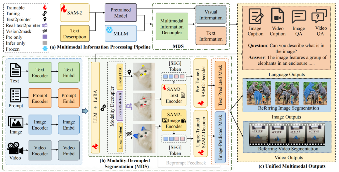 为确保训练的稳定性,文本标签被转换为 SAM-2 可解释的点级提示(point prompts),并与图像像素结合以生成监督掩码。模型通过最小化预测掩码与真实掩码之间的像素级交叉熵损失(pixel-wise cross-entropy loss)和 Dice 损失(dice loss),学习文本与视觉的对齐关系。在预训练阶段之后,于解耦阶段提取并优化模态特定的表示。仅需极少量的额外训练,这些解耦后的特征即可支持下游任务(如视觉问答、参考分割等)。