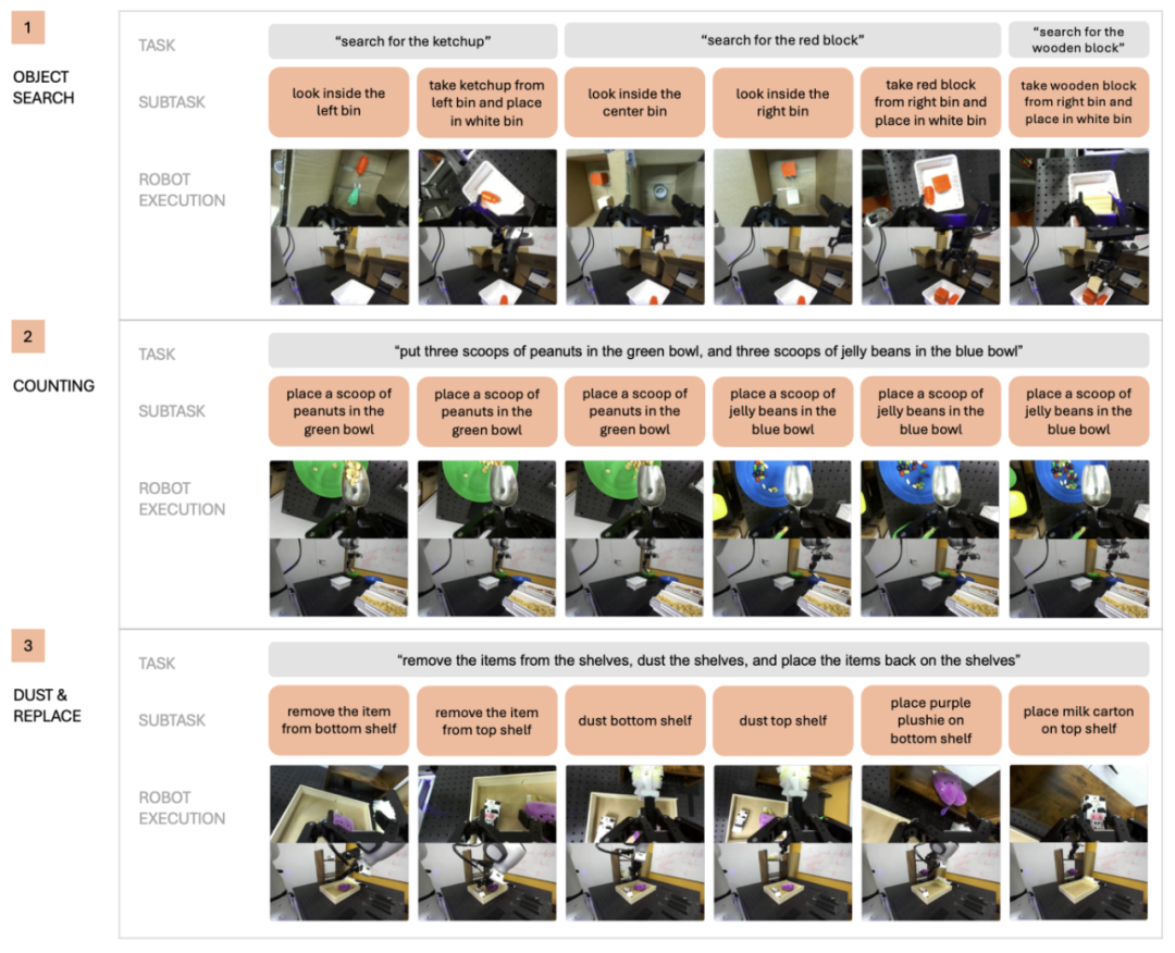 在三个任务领域中,研究人员对复杂指令理解、中间子任务执行及关键帧预测能力进行评估。每种方法在每个任务下均进行 20 次试验,并据此报告性能数据。