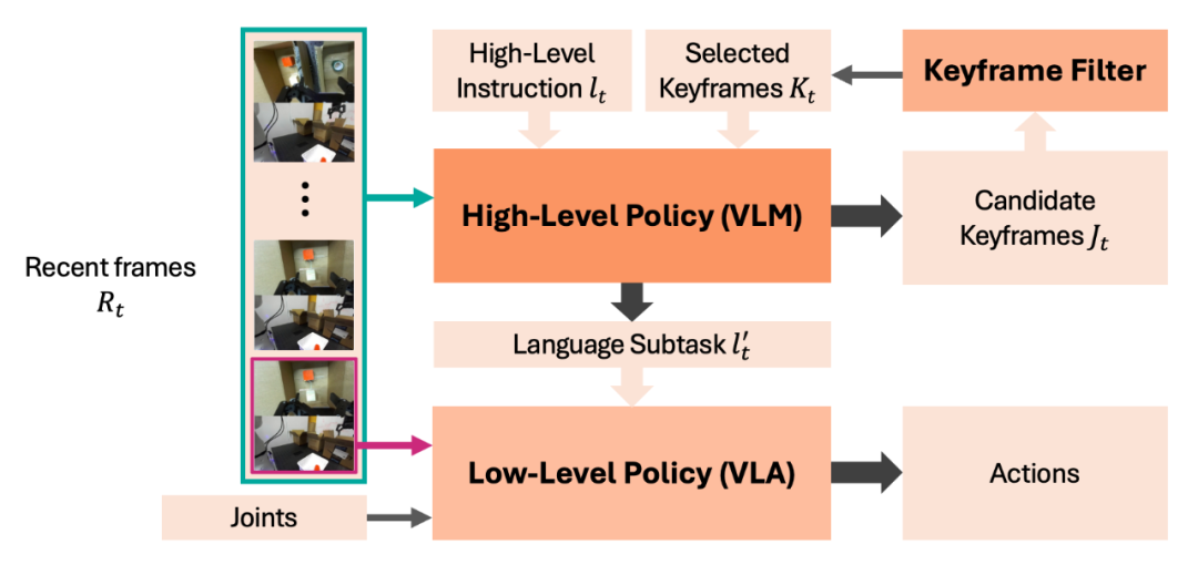 这种拆分让高层专注于长时序记忆推理,避免陷入高频控制的细节;低层专注于实时动作执行,无需负担记忆管理的计算成本,两者通过 “子任务指令” 衔接,既保证了记忆的有效性,又不牺牲控制响应速度。