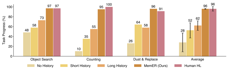 实验结果显示,MemER 在三项任务上的平均完成度达 90%,显著优于其他基线: