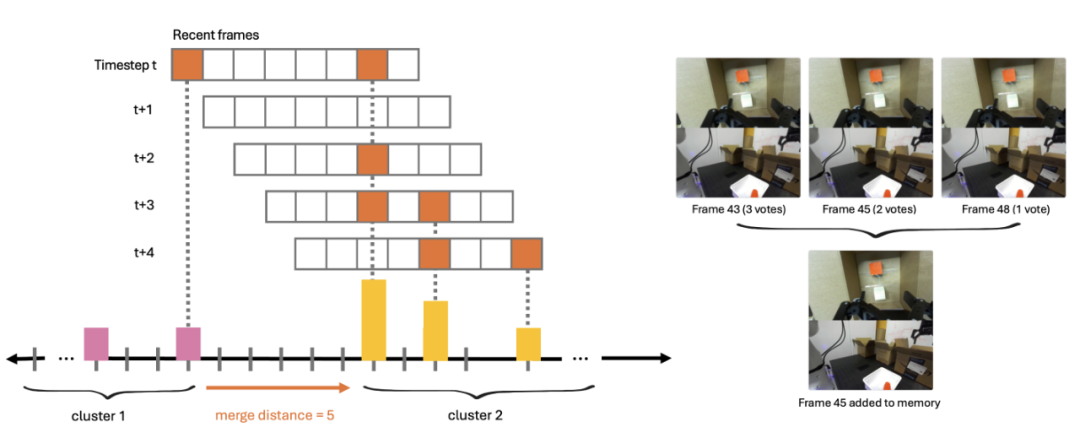 高层政策筛选关键帧的核心是 1D 单链接聚类算法,该机制确保机器人能从数千帧的任务周期中,动态保留最有价值的视觉信息,避免记忆库无限膨胀。具体流程分为三步:、