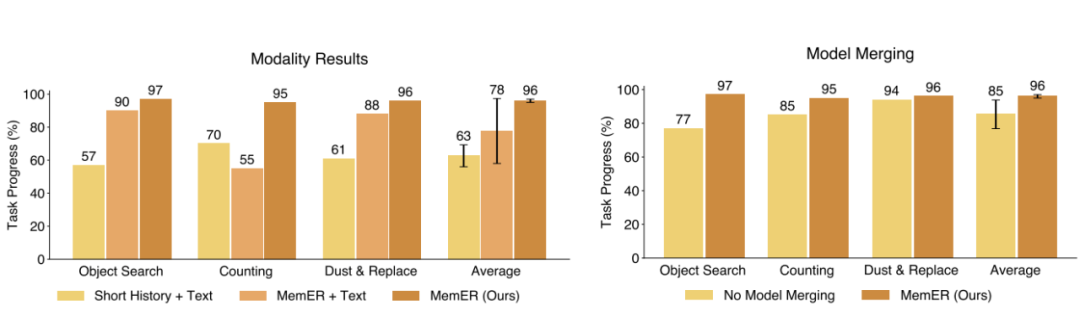 •在计数取物任务中,MemER 的取勺误差仅为 1 次(20 次实验平均),远低于长历史基线的 12 次、短历史基线的 26 次;