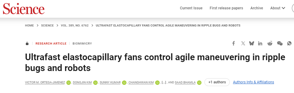 这项研究发表在顶级期刊《Science》上,题为"Ultrafast elastocapillary fans control agile maneuvering in ripple bugs and robots"。