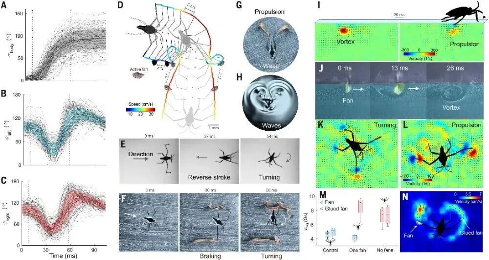 为了验证扇子的作用,研究人员还做了对比实验:用胶水把一些波纹蝽的扇子粘死,然后观察它们的运动表现。结果显示,扇子被粘死的虫子推进力和转向角度都显著下降,配有完整扇子的腿产生的水流速度是失活扇子腿的两倍。