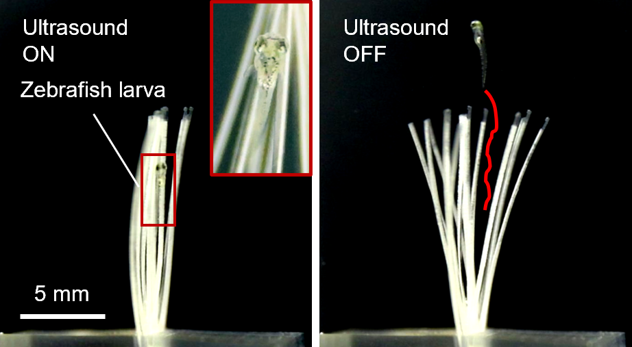 微泡阵列人工肌肉组成的小型软体抓取器抓取活体斑马鱼幼鱼,每个触手浸入水中时可容纳约10,000-20,000个微泡。(图片:施展等人/苏黎世联邦理工学院)