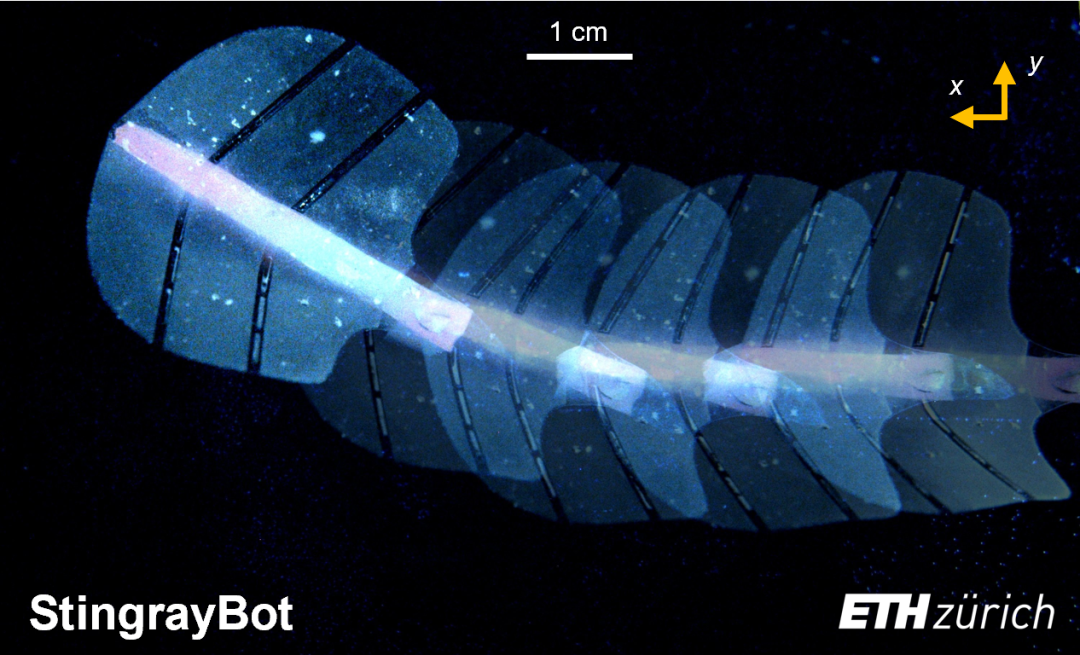 一种由微泡阵列人工肌肉制成的仿生机器人,Stingraybot,通过超声波引导模仿黄貂鱼波动。(图片:施展等人/苏黎世联邦理工学院)