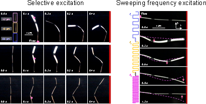 超声波的传播会引发微气泡的振荡,振动的气泡产生微射流,对肌肉底面施加均匀的反作用力,使其变形。由于不同尺寸的微泡表现出不同的共振频率,它们可以被独立激活,从而产生局部的反作用力。因此,通过不同尺寸微泡的排列以及使用扫频超声调制进行频率选择性激发,研究人员解锁了控制人工肌肉多模态变形的能力。