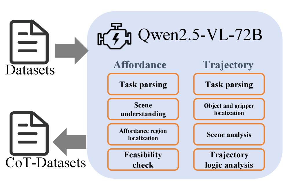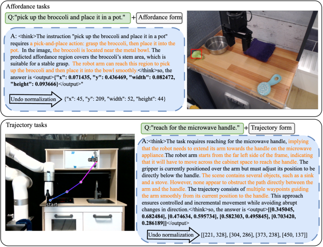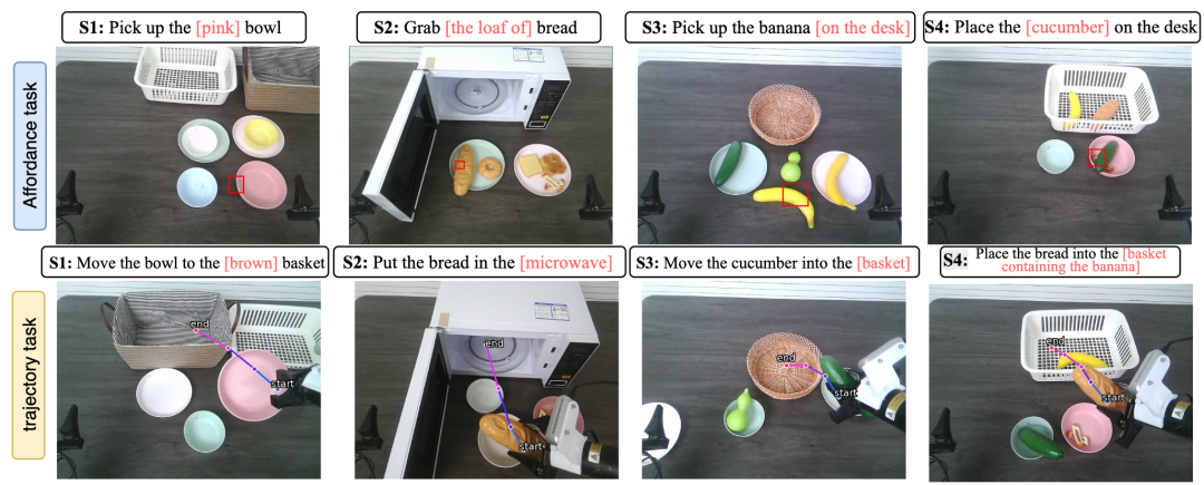 为此,研究团队开发了“VLA-CoT数据引擎”,生成了一个高质量的数据集VLA-CoT-13K。这个数据集包含了1.3万条标注数据,其独特之处在于,它为每一个任务都提供了清晰的“思维链”。这个思维链一步步地展示了模型应该如何分析场景、理解指令、识别相关物体及其属性、判断空间关系,最后才得出行动方案。更重要的是,这些推理步骤与最终的可供性标注(如边界框)和轨迹标注(如路径点序列)是严格对齐的。