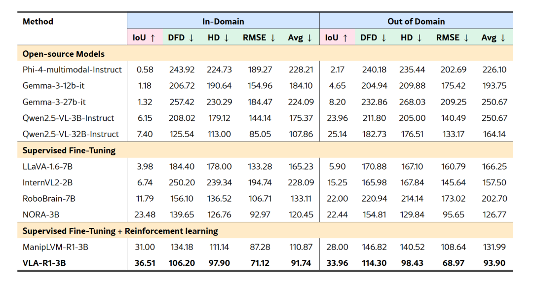 基准测试成绩斐然:在域内数据测试中,VLA-R1在可供性感知任务上达到了36.51的IoU(交并比),比之前最强的基线模型提升了17.78%;在轨迹预测任务上,其综合误差比基线降低了17.25%。更令人印象深刻的是,在分布不同的领域外数据上,VLA-R1同样取得了领先的性能,证明了其强大的泛化能力。