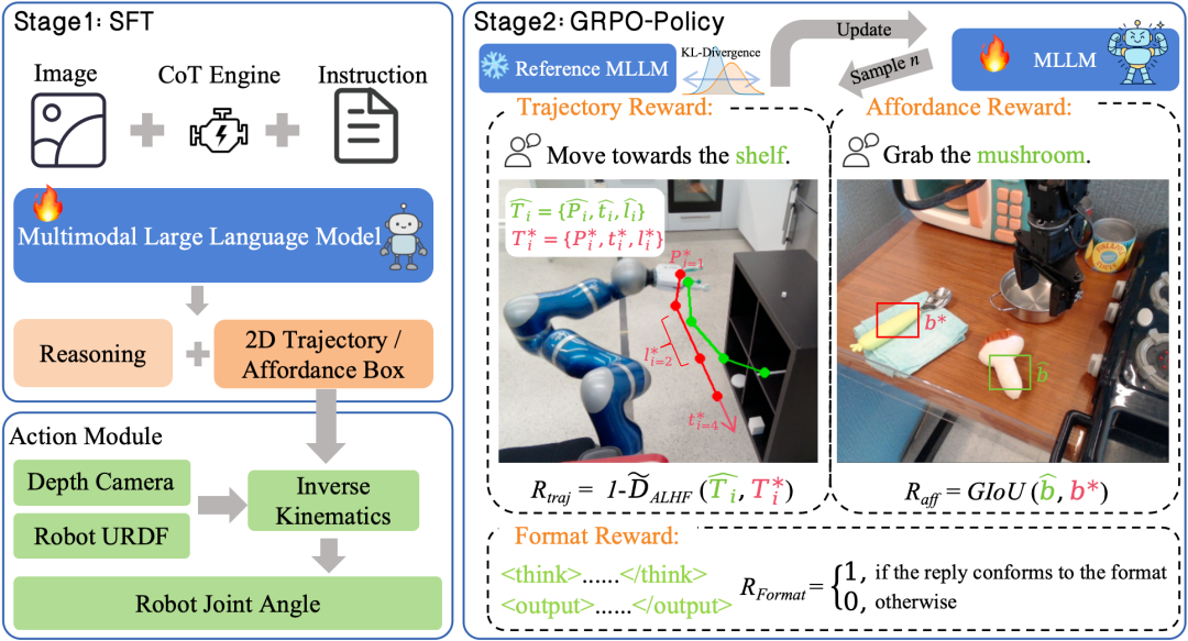 然而,现有的VLA模型存在两大挑战。首先,它们通常缺乏逐步推理:模型倾向于直接发出最终动作,而没有对可供性约束、几何关系或容器选择进行显式推理。这种局限性导致在颜色相似、重复实例或多个候选容器的情况下出现指令消歧失败。其次,训练后很少对推理进行系统性的强化。当前方法依赖于监督式微调(SFT),很少针对推理质量和执行效率进行奖励优化。即使使用强化学习(RL),奖励设计通常也是单目标的,难以同时优化区域对齐和轨迹一致性,从而降低了模型在分布外数据和真实世界场景下的性能。