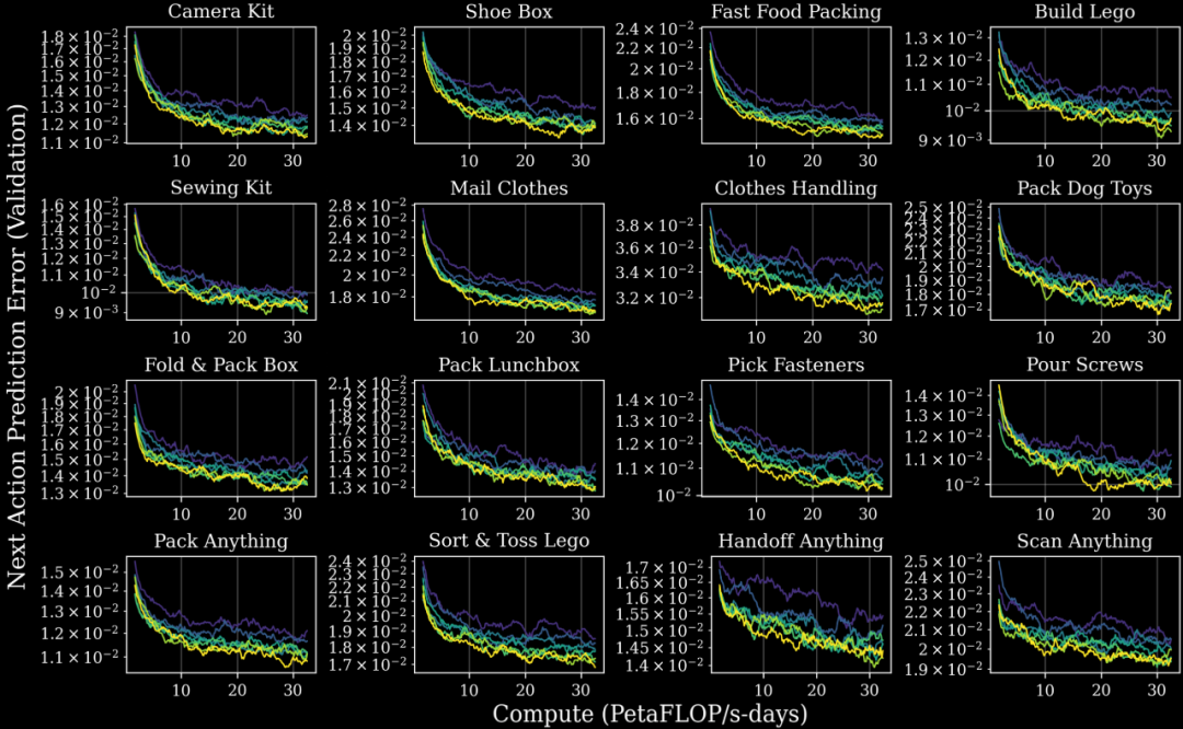 随着预训练数据(不同颜色)的不断增加,多任务模型在训练后的性能在所有 16 个任务集上均有所提升,验证损失(上图)和下一个动作预测误差(下图 4x4 网格)均有所降低。这些任务包括评估灵巧性(例如搭建乐高积木)、行业特定工作流程(例如快餐包装)和泛化能力(例如“_ any”任务)。