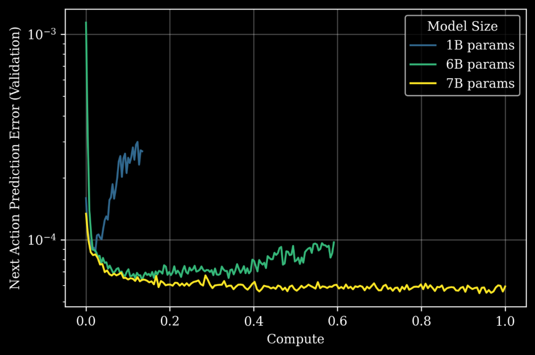 模型规模与预训练计算量的协同效应,在长时域下游任务场景中表现得尤为突出。实验数据显示,10 亿参数(1B)级别的模型,其性能在训练进程早期即进入稳定阶段且无明显提升;而 60 亿参数(6B)级与 70 亿参数(7B)级模型,其下一个动作的验证预测误差,会随着预训练计算量的逐步增加呈现持续降低的趋势。