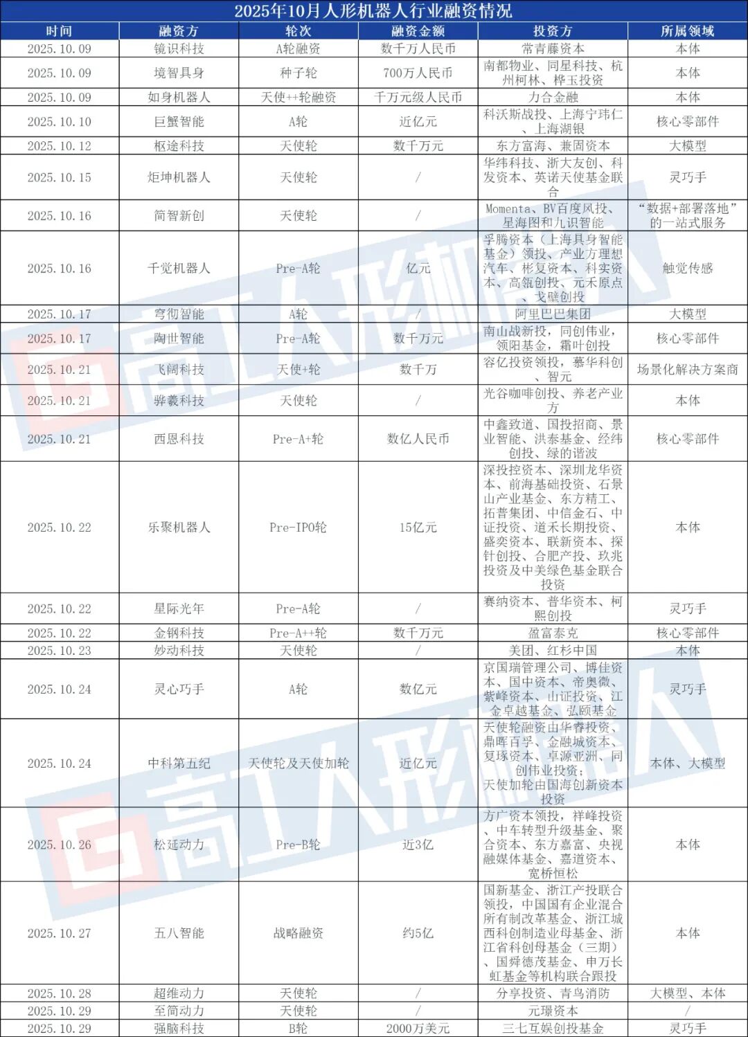 和产业链上游相比之下,10月,本体企业的融资表现平平,无论融资数量还是金额均有所收缩。然而,10月却诞生了中国人形行业金额最大的一笔融资,创下年度单笔融资纪录。