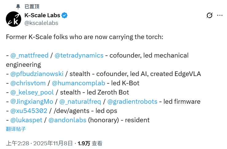 10月21日,具身智能大讲堂率先在X平台捕捉到,K-Scale Labs产品与工程负责人@JingxiangMo离职并创立Gradient Robotics新公司,聚焦美国机器人与物理AI关键难题!但当时K-Scale Labs并未在第一时间宣布新负责人就职,当时笔者就已隐约感觉该实验室可能因现金流问题暴雷,但未获得充足证据,时至今日,创始人公布了内部邮件,验证了笔者此前猜测。