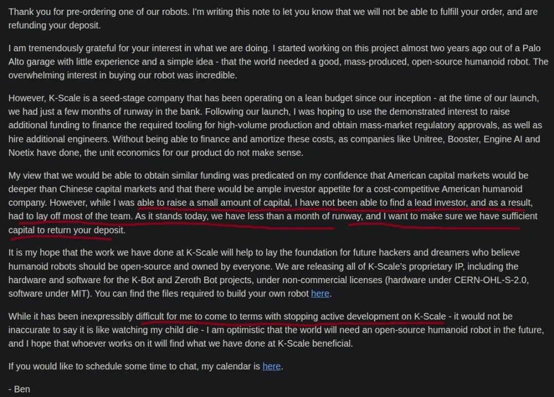 按照Benjamin Bolte的计划,7 月推出 Kbot 后,预计 1 周内完成融资,9-11 月启动量产。但现实是,他花了两个月时间奔走于硅谷风投之间,却屡屡碰壁。“投资者觉得 Kbot 的市场化成本太高,而且当时中国已有多家公司推出类似小型机器人,竞争压力骤增”,他解释道。更致命的是,团队内部开始动摇 —— 随着融资希望渺茫,核心成员陆续离职,原本 40 多人的团队迅速缩水,“开源文化能凝聚人,但不能当饭吃,大家需要看到明确的未来”。