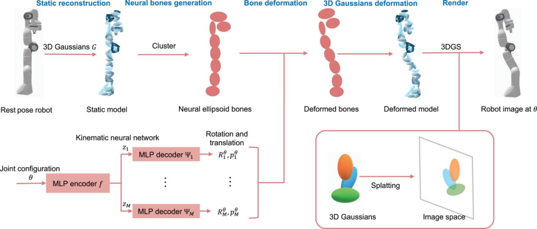 如果说3D 高斯函数构成了机器人的 “数字躯体”,那么神经骨骼与运动学网络则为其提供了 “运动控制系统”。该系统的核心是构建与机器人连杆对应的神经椭球骨骼,并通过神经网络实现关节角度与骨骼运动的映射。