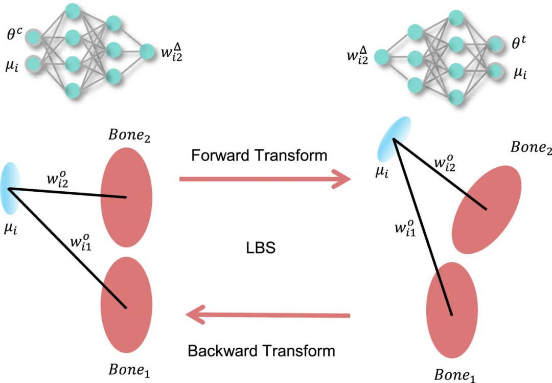 为了让3D 高斯函数构成的 “数字躯体” 跟随神经骨骼运动,技术团队采用线性混合蒙皮(LBS)技术,通过蒙皮权重将高斯函数与神经骨骼关联。蒙皮权重由两部分组成:一部分基于高斯函数与骨骼的马氏距离计算,确保几何关联性;另一部分由权重 MLP 预测,适配不同连杆的真实形态与复杂运动场景。通过加权求和与归一化处理,每个高斯函数的运动都成为相关骨骼运动的协同结果,从而实现机器人整体形态的自然形变。