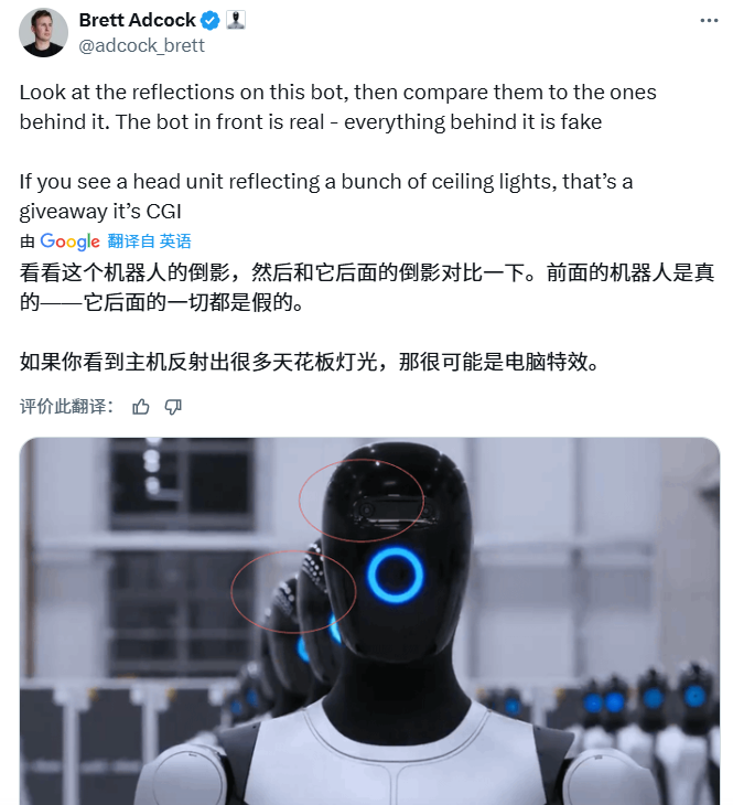 随着争议持续发酵,Figure AI公司CEO布雷特·阿德科克通过社交媒体公开发声。他声称通过分析光线在机器人头部的反射情况,发现只有前排机器人呈现真实的光线反射效果,而后排机器人的反射特征存在异常,因此判断后者很可能是通过电脑特效生成的。阿德科克强调,“如果你看到主机单元反射着一堆天花板灯光,很可能是电脑特效”。