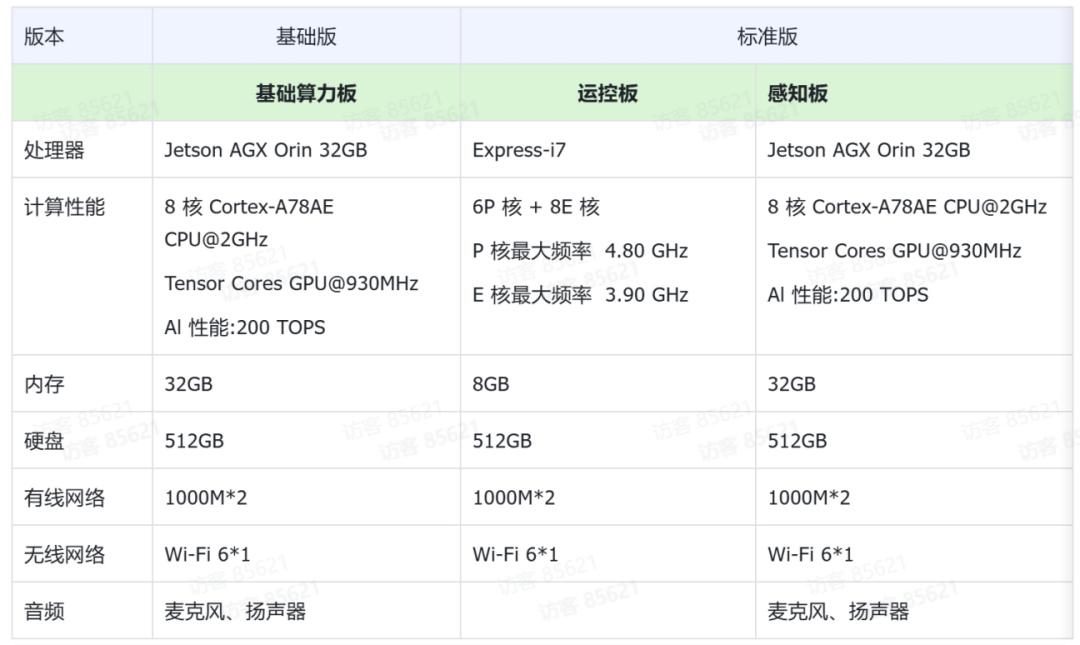 从上述配置参数可以看出,标准版与基础版最大的区别在于控制器。其中,基础版控制器仅配置200TOPS的Nvidia AGX Orin基础算力板,运控程序和感知程序都部署在该基础算力板之上。而标准版控制器则配置了 CPU运控板:Intel i7 1370p + GPU感知板:Nvidia AGX Orin,即运控程序部署在运控板上,感知程序部署在感知板上。