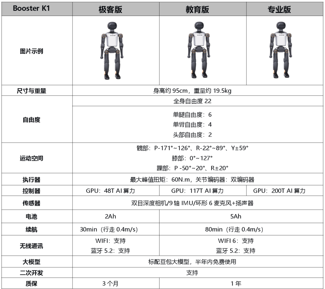 Booster K1设置了三个版本:极客板、教育版和专业版。三个版本在控制器算力、电池容量、续航时长以及质保周期上存在差异。