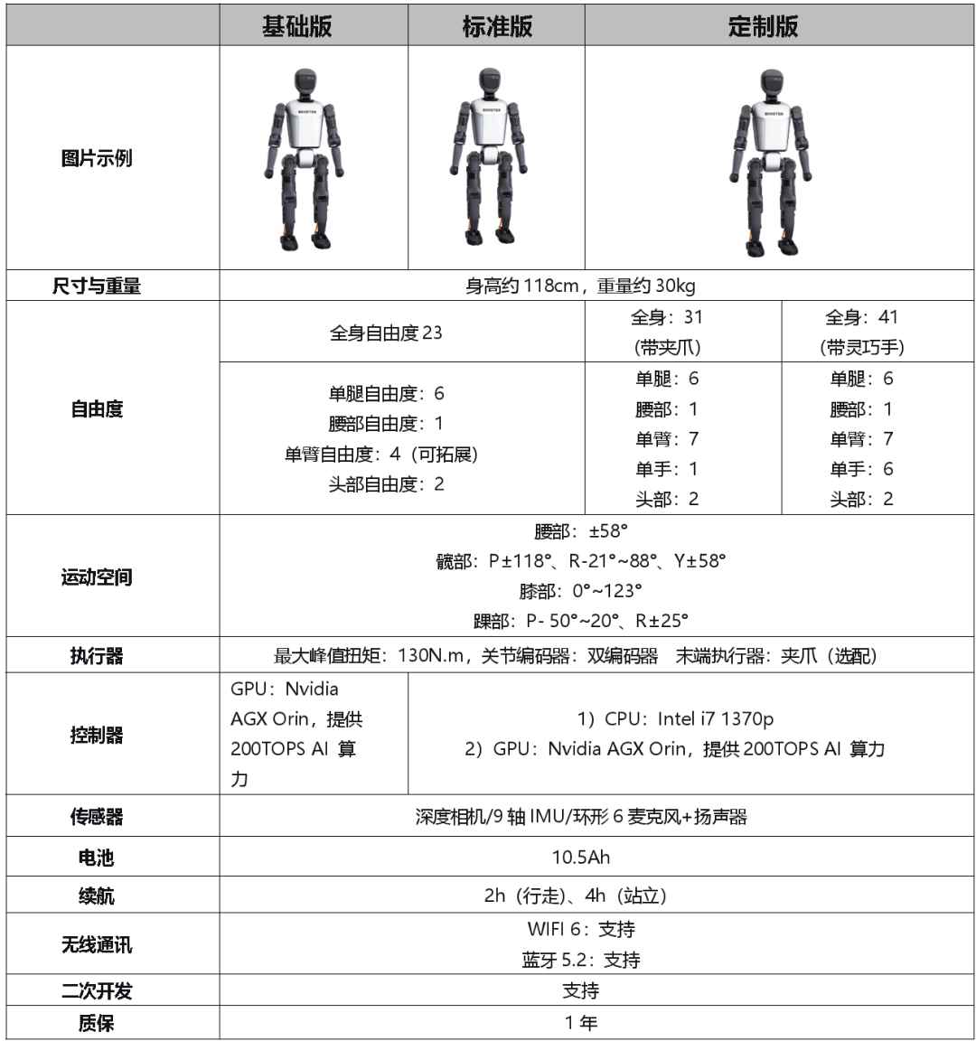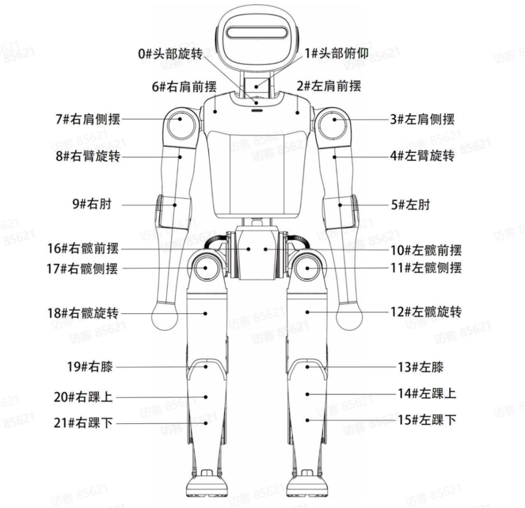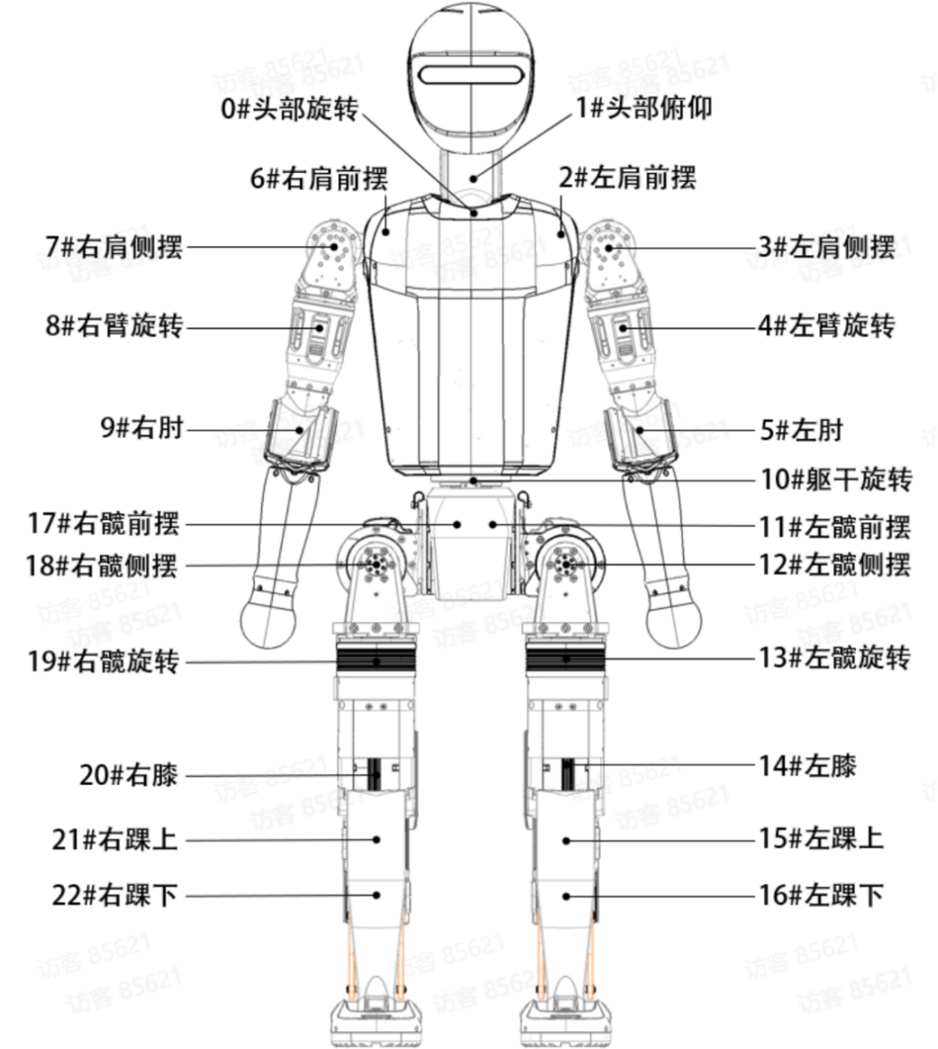 该产品全身拥有有22个自由度,其中,头部拥有 2 个自由度,包括头旋转关节和头俯仰关节;单手臂拥有 4 个自由度,包括手臂前摆关节、手臂侧摆关节、手臂旋转关节和肘关节;单腿拥有 6 个自由度,包括腿前摆关节,腿侧摆关节,髋转关节、膝关节、上踝关节和下踝关节。