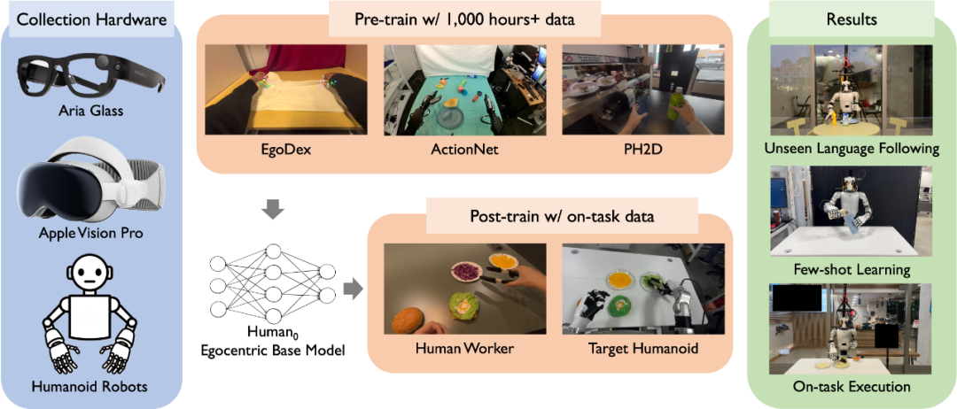 基于第一视角人类数据的大规模预训练与后训练方法。研究团队构建了一个大规模“人类-人形机器人物理交互数据集”(命名为PHSD),用于训练基础模型以学习第一视角下人类与机器人的行为模式。实验结果表明,Human0模型展现出多项优异性能,包括能精准响应机器人训练数据中未出现过的语言指令、具备少样本执行能力,以及在目标任务上的性能提升。