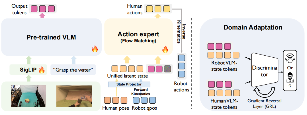 本文方法采用两阶段训练框架:(1)预训练阶段,以大规模“野生场景”人类数据与机器人数据为训练样本,所有数据均被映射至统一的“人类中心态-动作空间”;(2)任务后训练阶段,使用与任务目标对齐的人类及机器人演示数据进行微调。为弥合“具身差异”(即人类与机器人身体结构及运动机理的差异),研究团队引入域对抗判别器——该判别器以SigLIP视觉特征与动作-状态嵌入向量为输入,判断样本来源为人类数据还是机器人数据。通过梯度反转技术,此机制可促使策略网络的编码器学习“与具身无关的特征表示”,从而实现人类与机器人观测数据间的有效知识迁移。