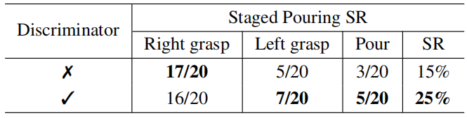 研究团队以倒水任务为对象,开展了域自适应技术的消融实验。倒水任务是一项具有挑战性的双手协同任务,可细分为3个阶段。文中报告的成功率(SR)为组合成功率。