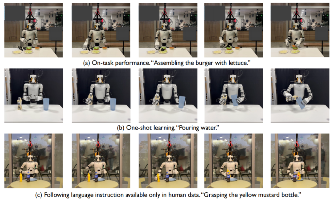 研究团队让机器人执行多项操控任务,以借助任务导向人类数据评估其少样本学习能力、语言指令跟随能力及鲁棒性。