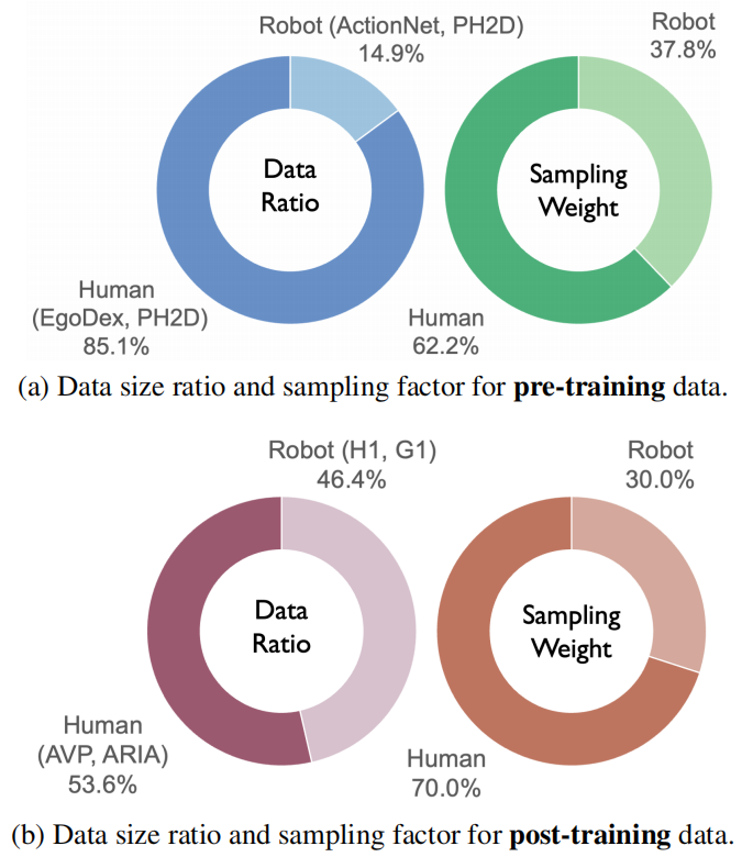 预训练阶段,主要用“野生数据”。模型先在1000多小时的人类动作里“泡着”,学怎么把视觉(看到的画面)、语言(听到的指令)和动作(该怎么动)对应起来。这时候会特意调整人类数据和机器人数据的比例,避免模型学偏,只认人类动作不认机器人动作。