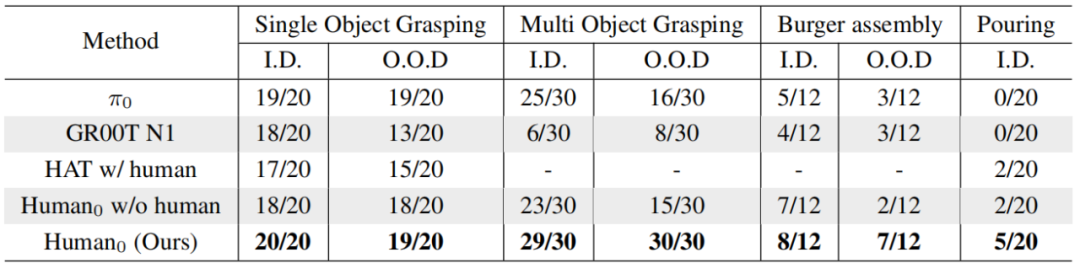 团队在Unitree H1和G1两款人形机器人上,测了单目标抓取、多目标抓取、汉堡组装、倒水四个任务,还特意设置了“见过的场景”(分布内)和“没见过的场景”(分布外),结果Human0的表现超出了预期: