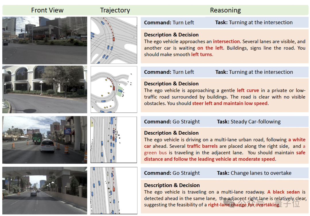 在每种情况下,模型都应感知道路上下文,整合自车状态和导航意图,并做出连贯的决策。
