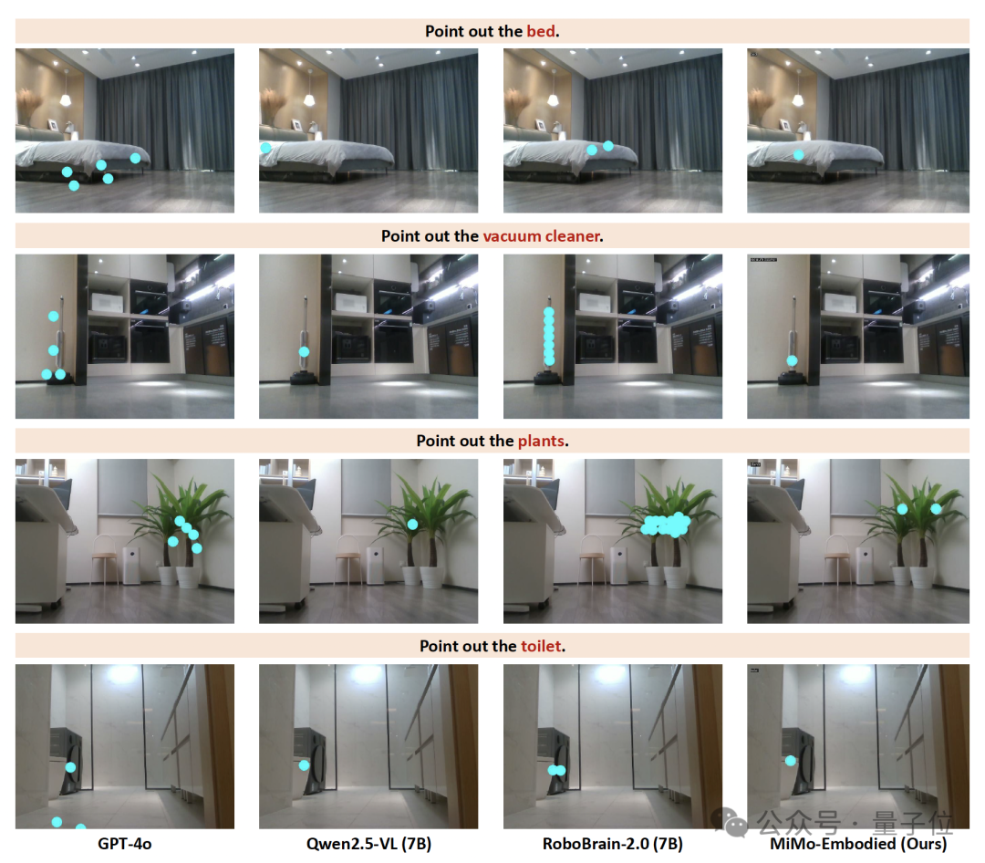 在具身导航中,相较于GPT-4o、Qwen2.5-VL和RoboBrain-2.0,MiMo-Embodied展现出在多样化家庭场景中增强的对象定位能力和一致的性能。