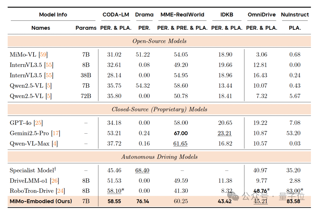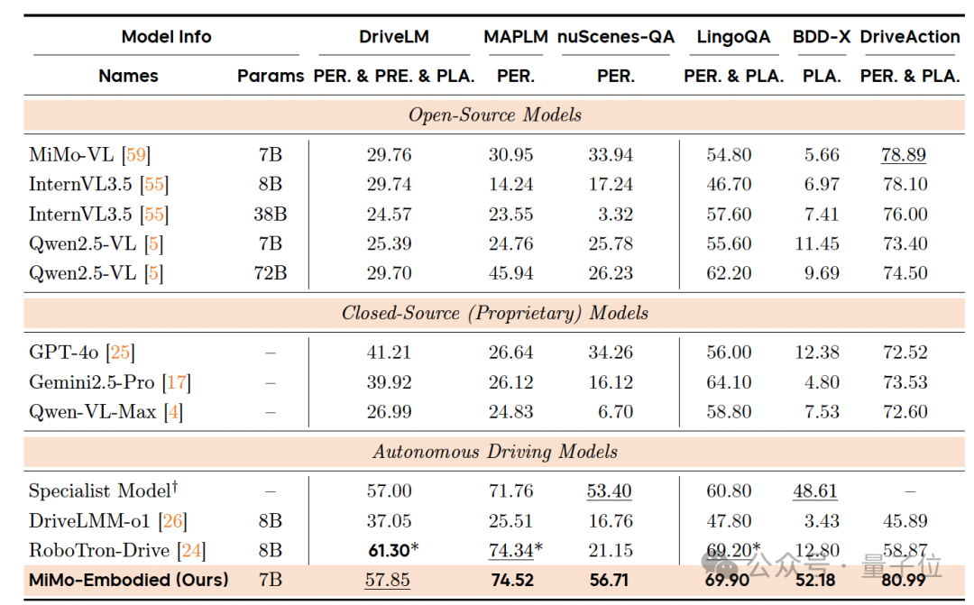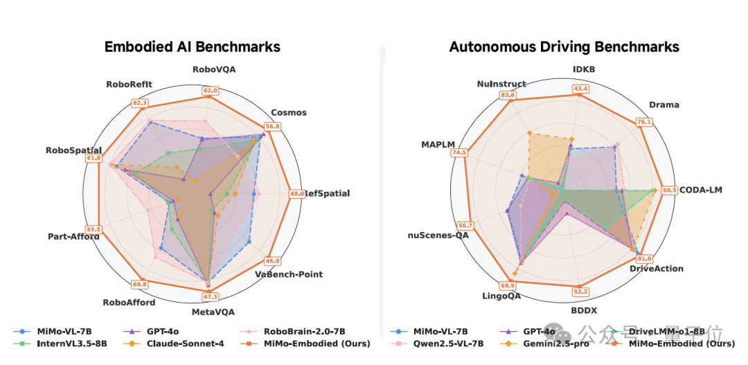 在实测效果上,MiMo-Embodied在自动驾驶与具身智能共计29个Benchmark上均超越了现有的专用模型及通用模型,实现了跨领域的最先进(SOTA)性能。