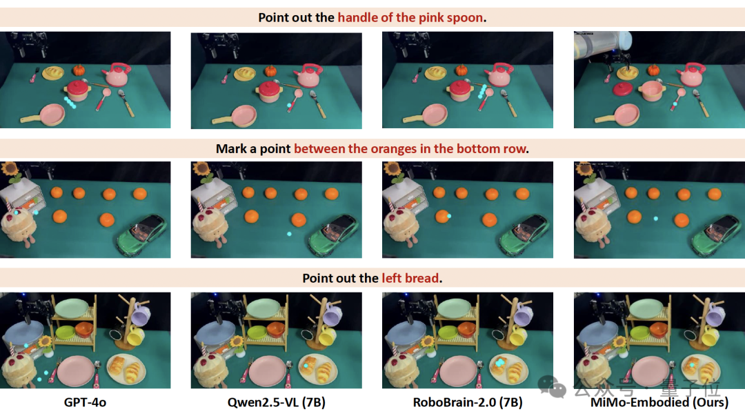 在操作任务中,MiMo-Embodied同样展现出强大的可供性和空间推理能力。