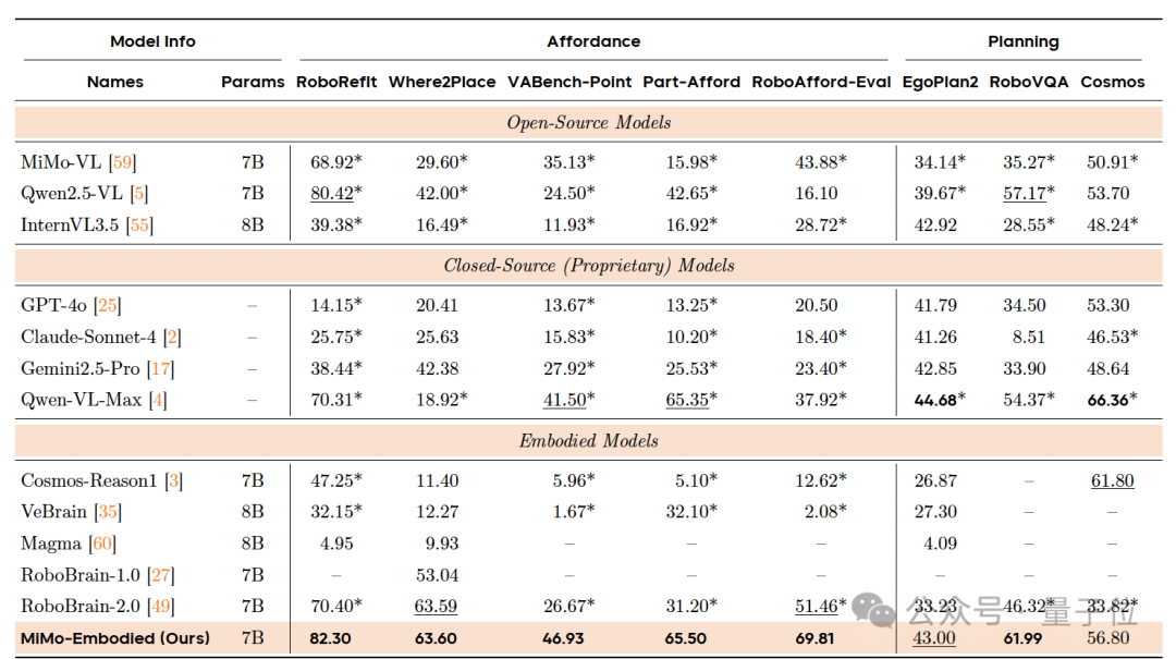 结果表明,MiMo-Embodied 取得了具有竞争力的结果,与通用多模态模型和专用具身模型相比,在可供性预测和空间理解方面表现出特别的优势。