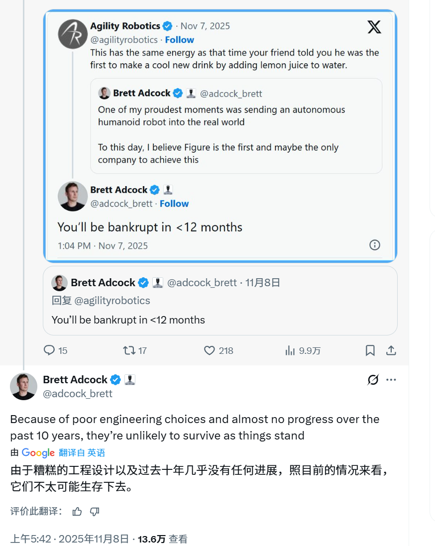 与马斯克一样高强度“冲浪”且好斗的Adcock显然不打算忍下这口气,马上反呛:“不到12个月你(Agility Robotics)就会破产”,他还进一步补充称:“由于糟糕的工程设计以及过去十年几乎没有任何进展,照目前的情况来看,它们不太可能生存下去。”