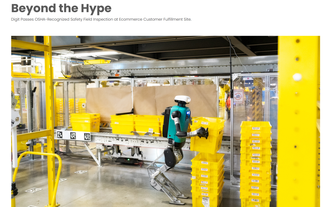 Agility Robotics在本周一宣布,Digit已通过由美国职业安全与健康管理局(OSHA)认可的国家检测实验室(NRTL)现场审查。这意味着,Digit的安全性已经得到监管机构认可,获得了安全认证,可以在真实工作环境中与人类并肩作业。