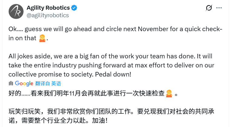 在几轮短兵相接后,Agility 选择收手,用一句打圆场的回应结束战局:“好吧……看来我们得等到明年11月再来快速确认一下了。玩笑归玩笑,我们非常欣赏你们团队的工作。要兑现我们对社会的共同承诺,需要整个行业全力以赴。加油!”