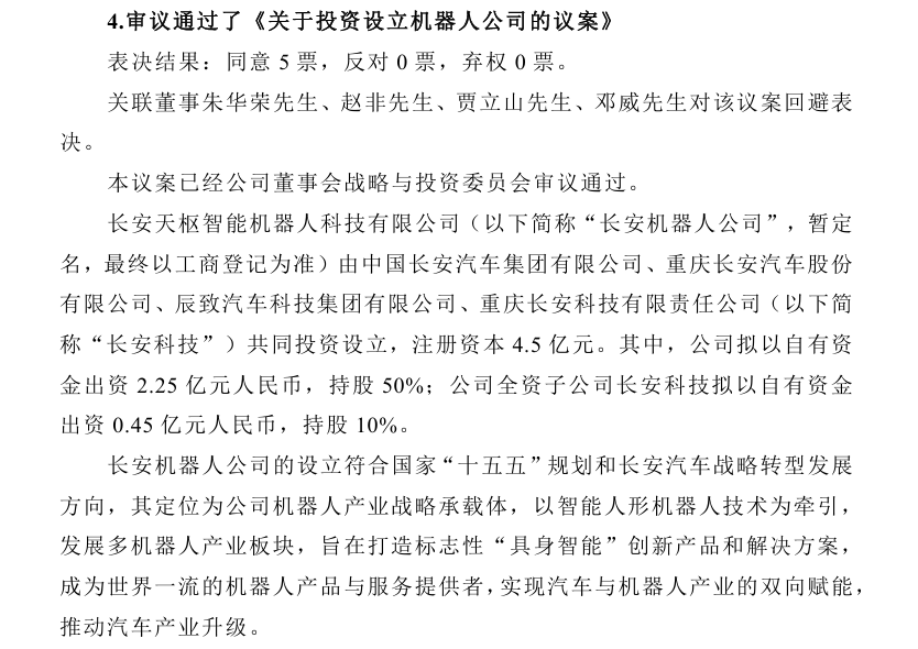 11月28日,长安汽车发布公告称,将联合中国长安汽车集团有限公司、辰致汽车科技集团有限公司及重庆长安科技有限责任公司(以下简称“长安科技”),共同投资设立长安天枢智能机器人科技有限公司(以下简称“长安机器人”)。其中,长安汽车以自有资金出资2.25亿元,持股50%。