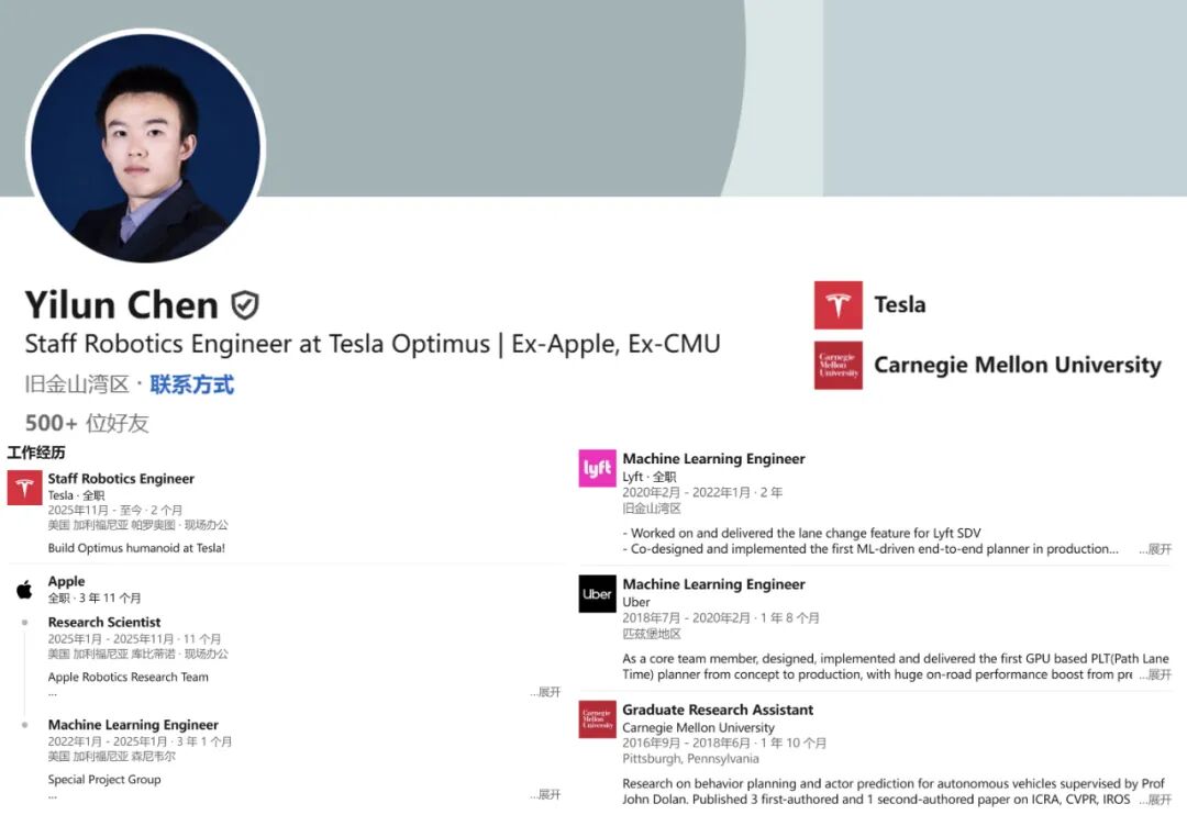此前,他曾在苹果公司担任机器学习工程师和机器人研究科学家四年。此次战略性招聘凸显了特斯拉致力于推进人工智能驱动机器人技术的决心,因为陈一伦在机器学习和实际机器人应用方面拥有丰富的经验。
