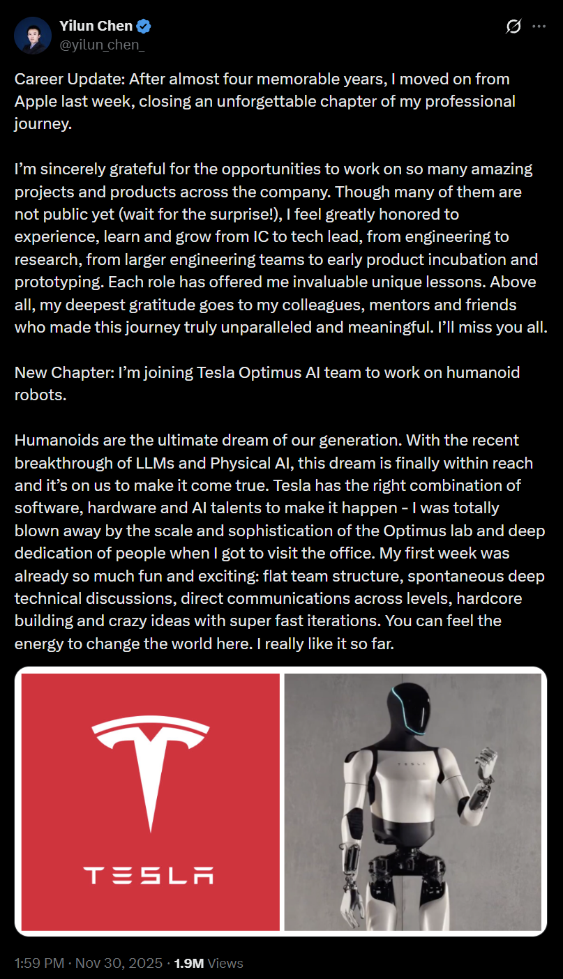 内容来源:https://teslanorth.com/2025/11/30/tesla-snags-apple-ai-engineer-for-optimus-robot-push/
