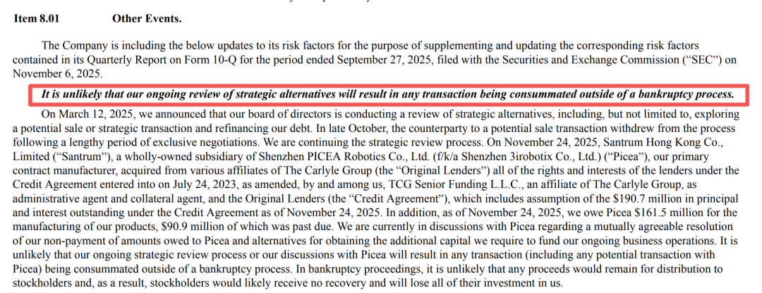 文件中直白地表示,一旦进入破产程序,“股东很可能无法获得任何回报,并将失去全部投资”。此外,iRobot坦承其生存完全依赖于主要代工厂杉川的持续生产支持,如果杉川因巨额欠款问题终止合同,iRobot将无法及时找到替代制造商,导致业务彻底中断。这意味着,这家曾经定义了一个品类的公司,其生死存续在很大程度上取决于其最大债权人与供应商的决策。