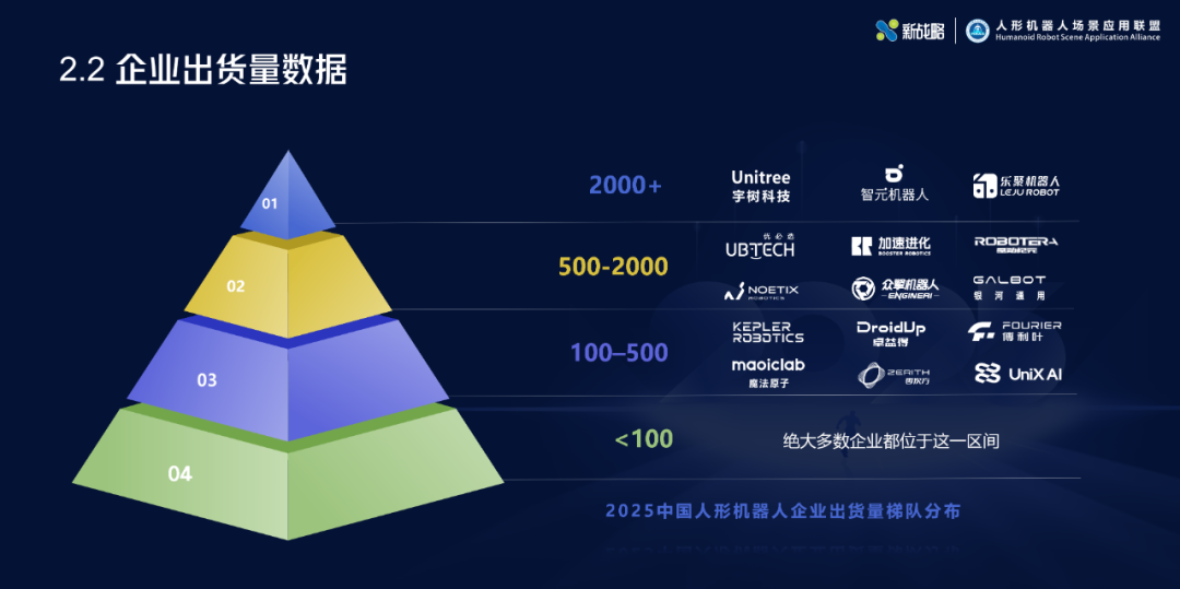 当前中国人形机器人企业的出货情况呈现出明显的阶梯式结构,这一格局反映出行业正从“百花齐放的早期阶段”进入“规模化优胜者阶段”。(以下企业出货量信息仅作参考,后续数据可能还会进一步更新。)