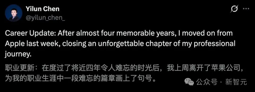 Yilun Chen于上周正式离职,为在Apple的精彩旅程画上句号。