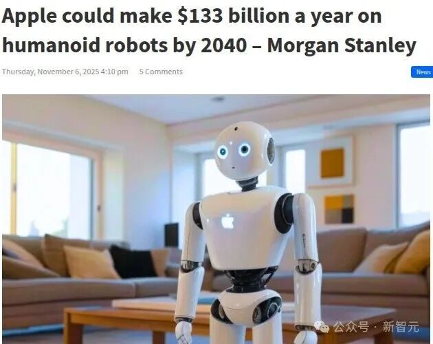 摩根士丹利研究称,到2040年,假设占据9%的市场份额并结合广泛的硬件及服务,苹果公司每年可能从人形机器人中获得1330亿美元的收入。